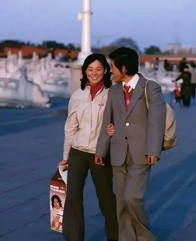 天安门广场上 , 一对情侣散步 , 女孩提着纸箱子装的家电 , 男的穿灰色西装 , 两人笑得特别幸福。