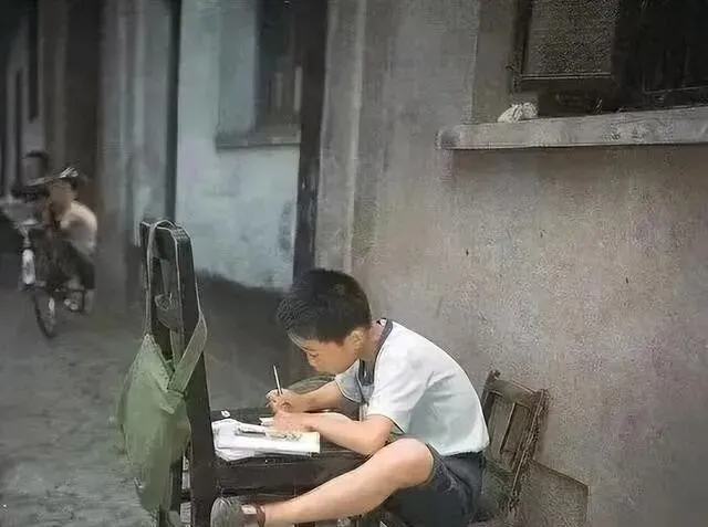 一个小朋友坐家门口 , 两只脚翘凳子上 , 凳子背后挂着解放包 , 埋头写作业。 这画面 , 太熟悉了。