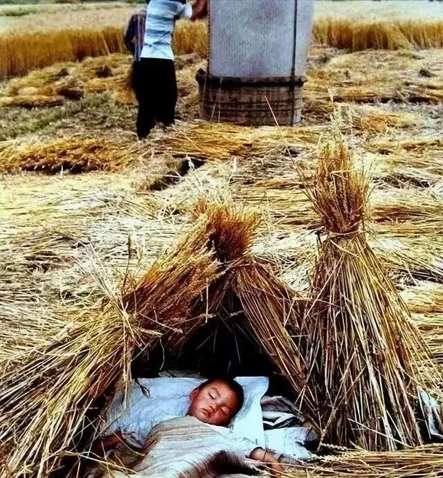 大人干活的时候呢 , 小孩就在草垛里睡觉 , 铺着被子枕着枕头 , 旁边家人忙着收稻子 , 画面温馨极了。