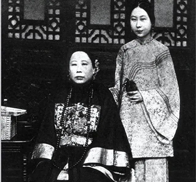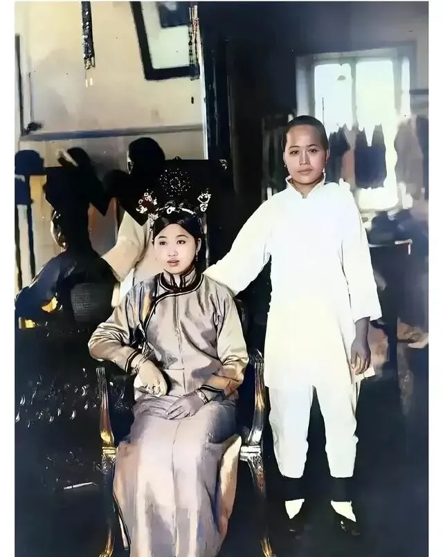 这是富家千金和丫鬟的合影 , 你别说 , 这大小姐确实比皇帝的嫔妃好看。 但你再仔细看 , 她的脚 , 也是三寸金莲。