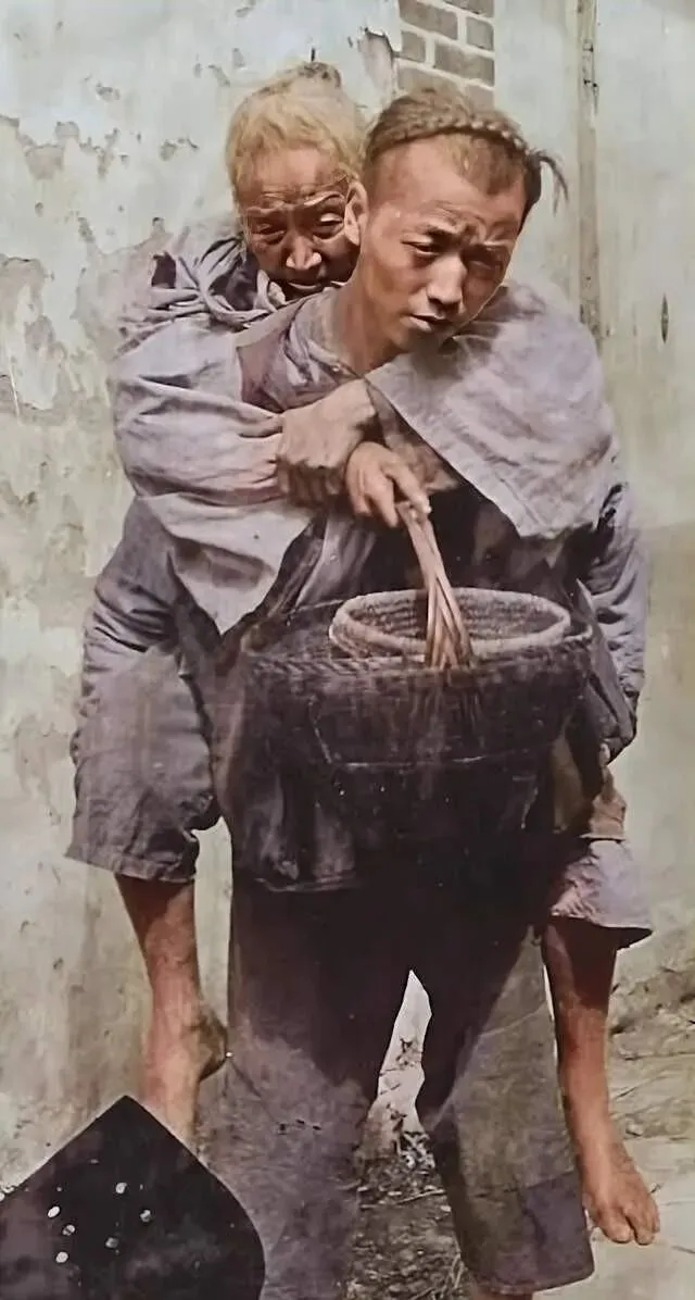 还有更惨的 , 儿子背着老母亲沿街乞讨。