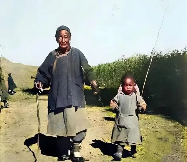 满族老太太带着小孙子出门玩 , 正儿八经的旗人打扮。