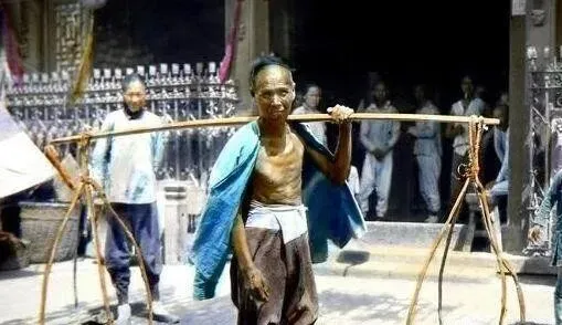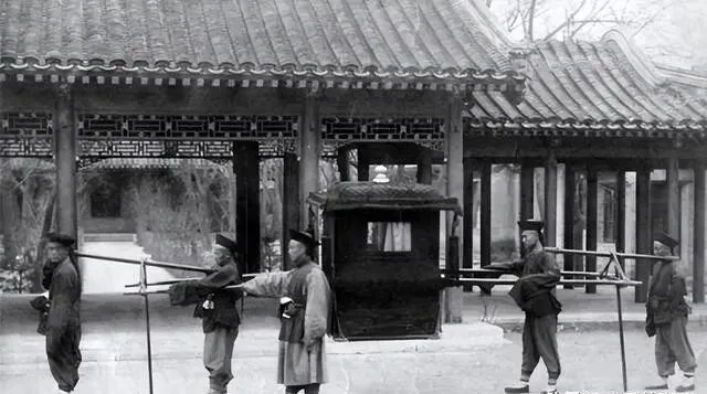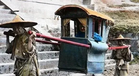 清末的轿子长这样 , 两个轿夫抬着 , 轿夫穿得破破烂烂 , 坐轿子的夫人倒是体面。