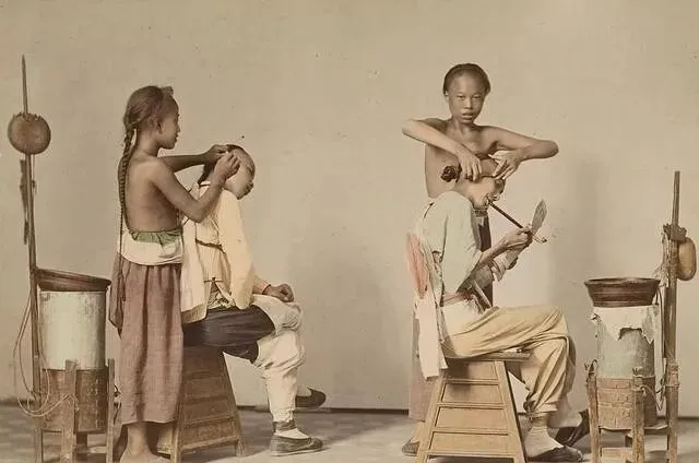 这是晚清的剃头师傅 , 剃头、刮脸一套下来。