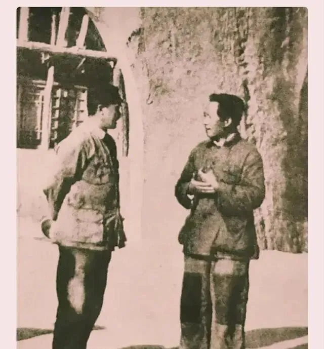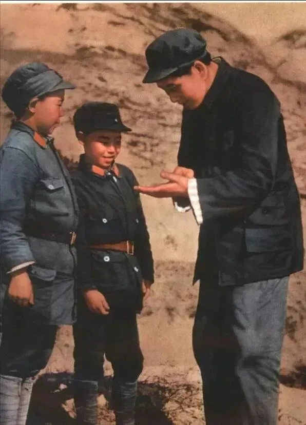 毛主席弯腰和两个小八路说话的照片 , 课本里见过吧?