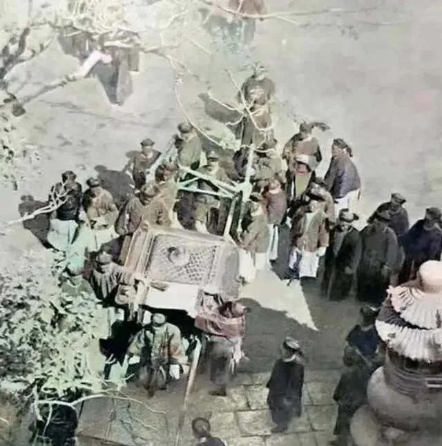 更绝的是慈禧那张 , 视角像趴房梁上拍的 , 老佛爷发现了也没发火 , 反而挥着手绢打招呼 , 排场大得吓人 , 一看就是她的出行队伍。