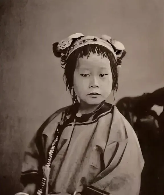 有个小姑娘 , 头饰特别精致 , 前额垂着零碎的流苏 , 两只手腕套着粗粗的银圈子 , 一看就是大户人家。