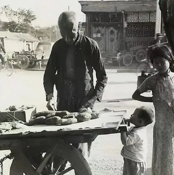 还有卖吃食的老爷子 , 一个跟板车差不多高的小男孩踮着脚 , 使劲想闻那个香味 , 他姐姐站旁边 , 也馋 , 但比弟弟克制多了。
