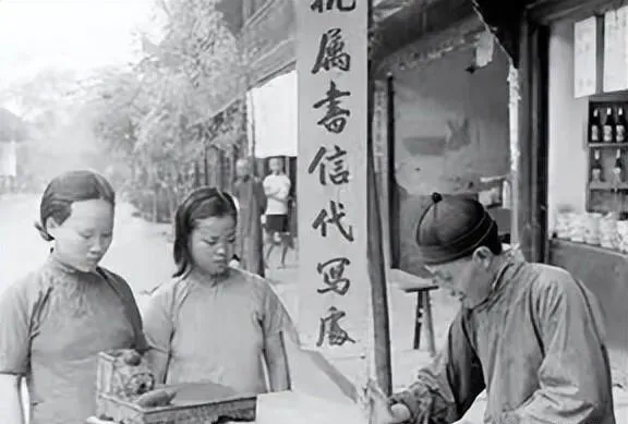 有个铺子招牌写着"书信代谢" , 专门替人写信的 , 那年头文盲率高得吓人 , 识字就算知识分子了 , 这行当存在太正常了。