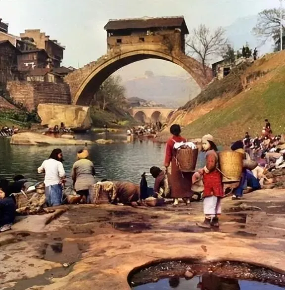 重庆那张一眼就能认出来 , 河边台阶上好多人拿着大框子洗衣服 , 看身后那高高长长的楼梯 , 重庆特色没跑了。
