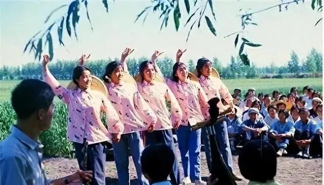 图中女声小组唱的样子太提气了,粉色的上衣在阳光下泛着亮,竹编的大草帽背在身后,手势整齐划一,脚跟一抬一落,后面围了一圈人,笑声和拍手声串在一起,妈妈说,忙完一茬活,唱两句解个乏,比喝凉茶还管用,那会儿精神世界一点不穷,日子苦点也不怕。