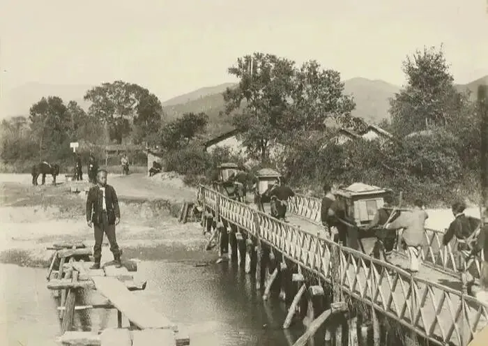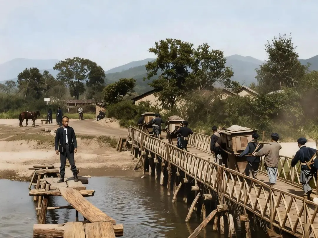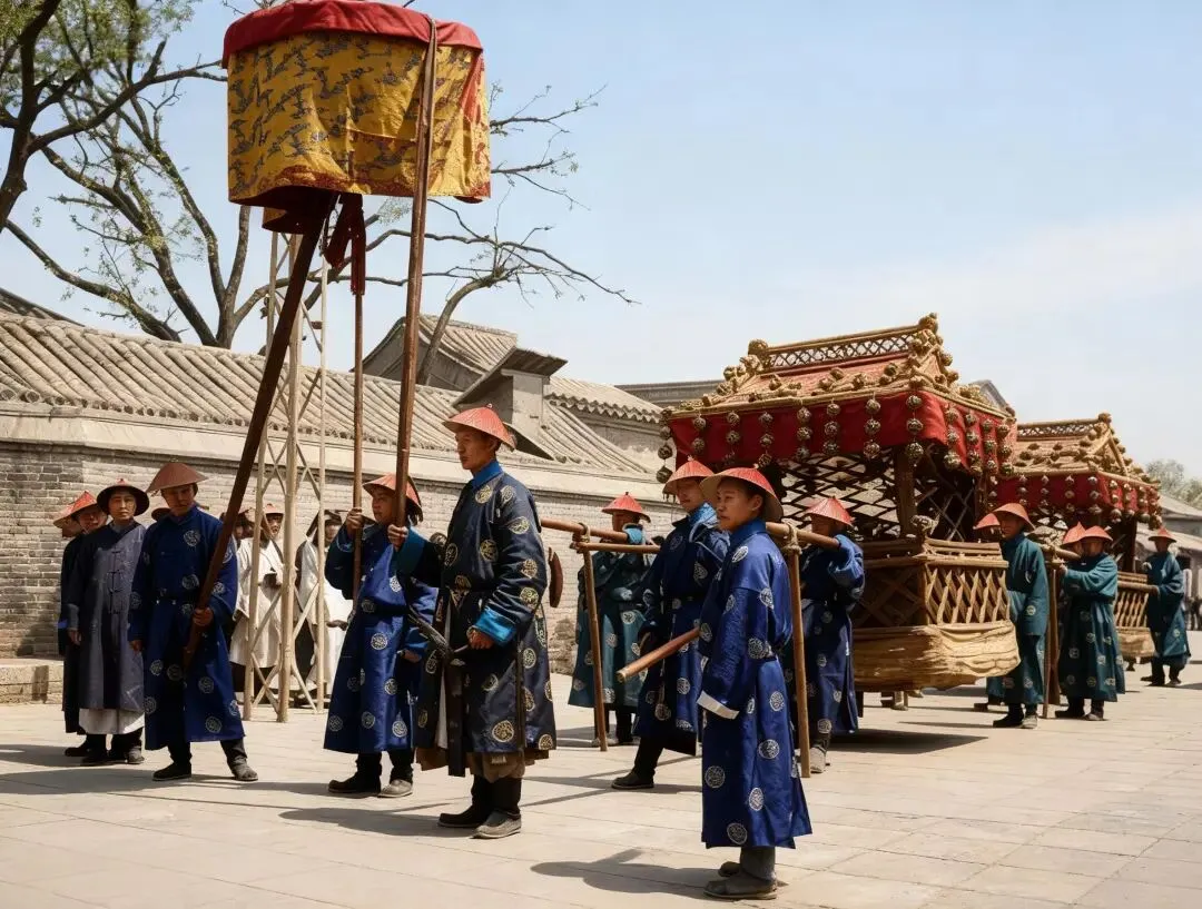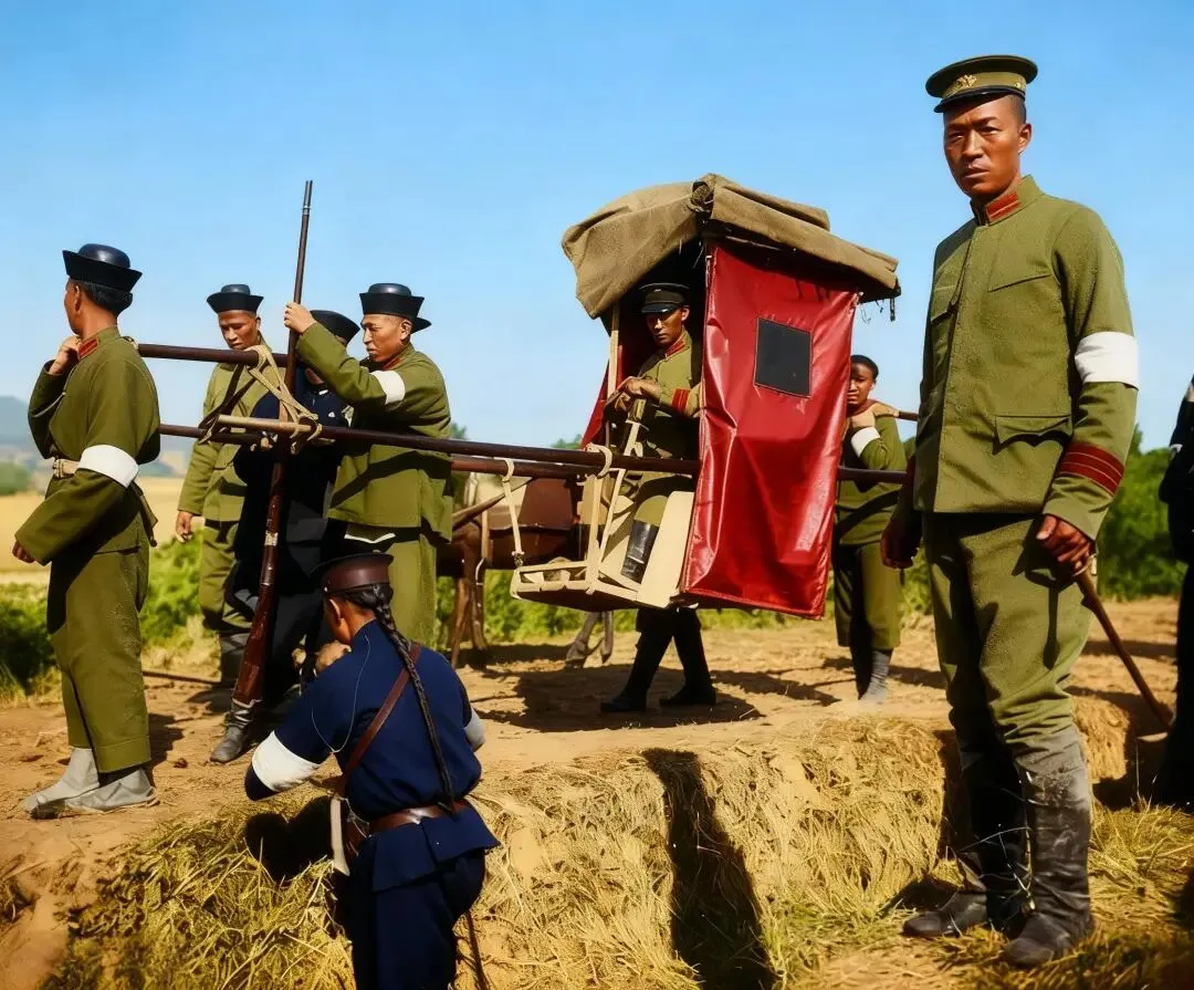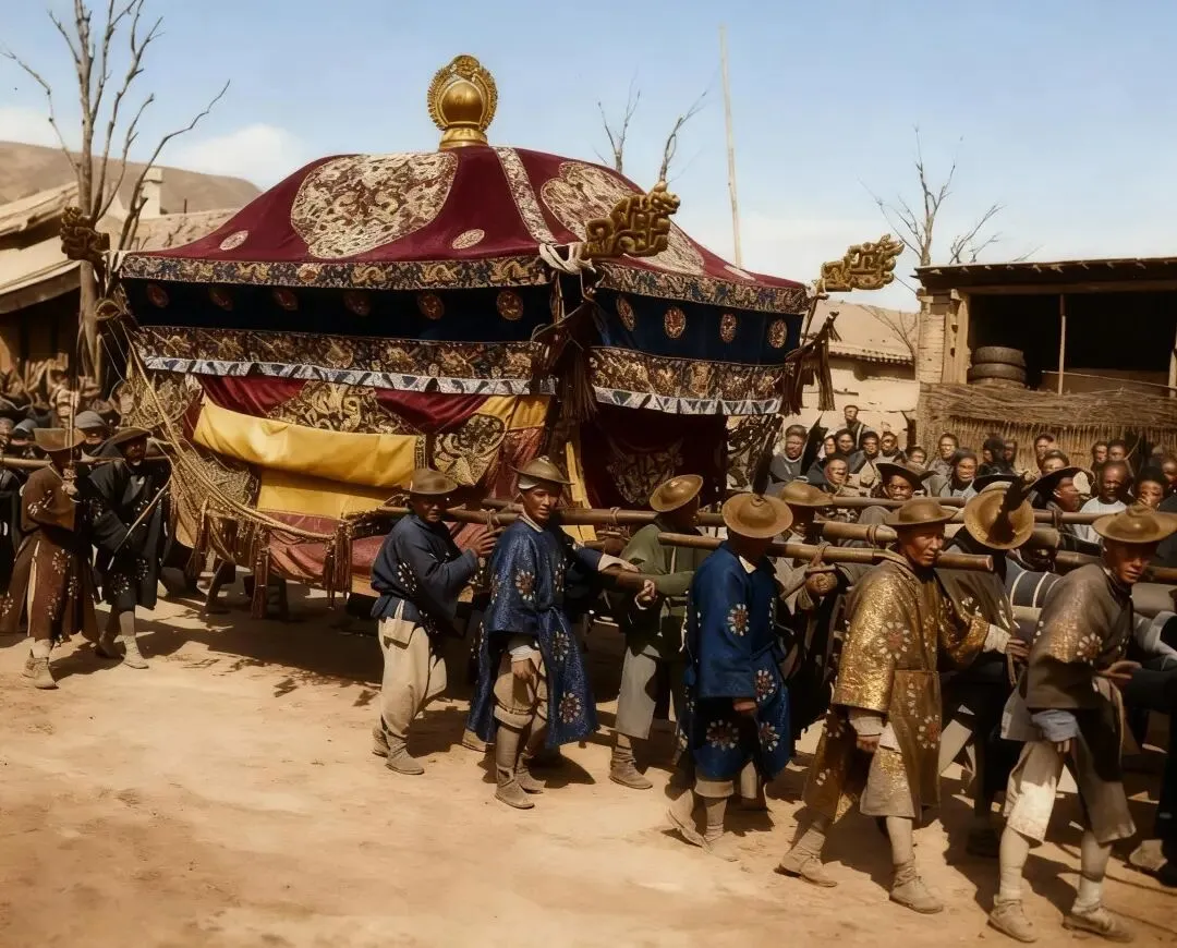 与民间花轿形成强烈反差的,是那顶缀满龙凤纹样的明黄轿辇。按照《大清会典》规定,这种"十六抬"规格的礼轿唯有帝后可用,轿身八面围合的纱幔既维持着皇权的神秘感,又隐喻着统治阶层与民众的隔阂。轿夫们头戴的红缨帽与蓝色号衣,显示出他们"八旗步军"的特殊身份,而队伍两侧佩刀侍卫的冷峻面容,则暴露出礼制秩序背后的暴力支撑。当这顶象征皇权的轿子走过斑驳宫墙时,背景中隐约可见的西式建筑尖顶,恰似刺破封建天幕的时代楔子。在乡村石桥上列队而行的便轿,呈现出另一番质朴景象。这些以竹篾为骨、粗布为幔的交通工具,没有繁复纹饰却透着实用智慧。轿夫们头戴的尖顶斗笠与赤脚草鞋,诉说着底层民众的生存状态。值得注意的是桥边那位穿黑色短打的男子,他胸前模糊可见的西式怀表链,暗示着外来文明已开始渗透到交通领域。这种简陋轿子构成的运输网络,实则是维系晚清城乡经济的毛细血管,轿杆上深深的勒痕里,浸透着无数苦力的血汗。最后一帧画面堪称时代转型的经典注脚:绿营军装的士兵护卫着一顶半新不旧的轿子,轿身的红绸已泛出灰白,却仍固执地保留着传统形制。这种"兵护轿行"的诡异组合,暴露出晚清政权在军事近代化与礼制保守性之间的撕裂。轿夫中既有留着辫子的传统苦力,也有剪去发辫的新式兵丁,他们共同抬着的不仅是某位官员,更是一个摇摇欲坠的旧秩序。远处田野里成熟的麦田与近处轿夫脚下的泥泞,构成了传统农业文明与近代工业文明的隐喻性对峙。这些凝固在影像中的轿子,最终都化作了历史的尘埃。当蒸汽机车的轰鸣声从远方传来,轿杆上的勒痕逐渐被铁轨的锈迹覆盖。但那些关于权力、等级、民生的集体记忆,依然在泛黄的相纸上微微颤动,提醒着我们:每个时代的出行方式,都是其精神内核最忠实的镜像。