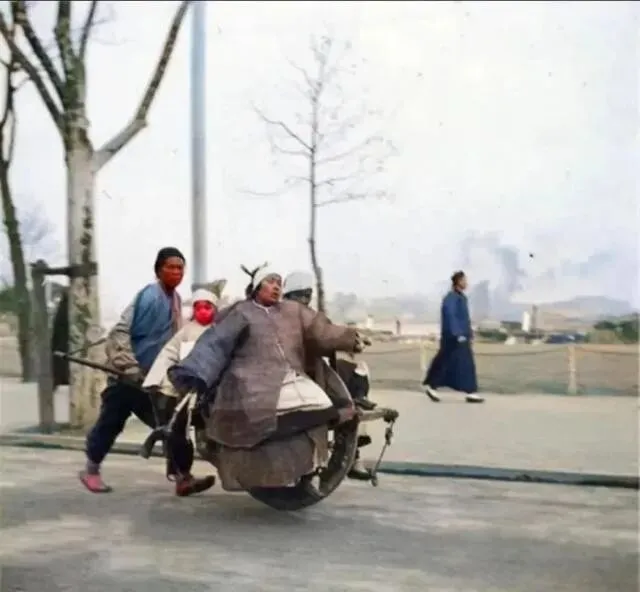 独轮车上坐着女人和孩子 , 男人在后面推。 为啥?因为女人都是小脚 , 走不了远路 , 孩子又小 , 只能这样出门走亲戚。