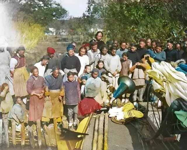 最后一张 , 外国人在船上放留声机 , 一群人围着看稀奇。