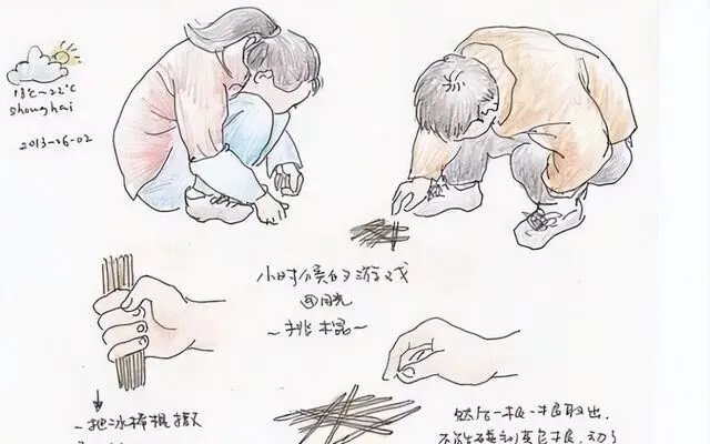 还有挑棍 , 得攒好多冰棒棍才能玩 , 三四个小伙伴把棍子凑一块儿 , 谁挑得准谁赢。