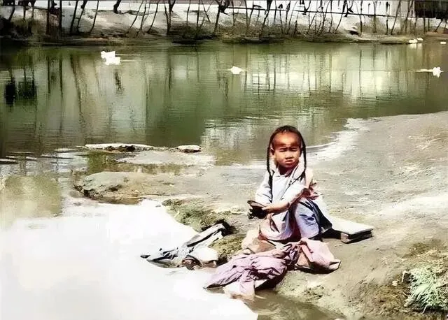 先说那张童养媳的照片吧 , 小女孩坐在地上 , 面前一大堆衣服要洗