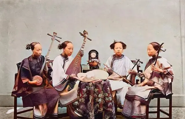 还有四位女艺人的合影 , 手里分别拿着三弦、琵琶、大广弦、六角弦