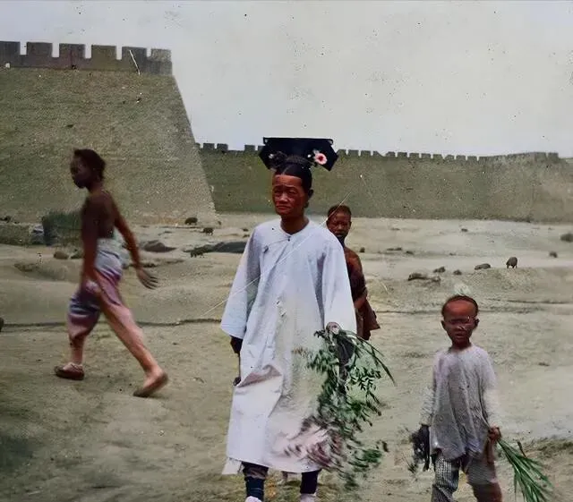 满族女子带着小孩那张 , 手里拿的是艾草和蒲草 , 应该是端午前后拍的