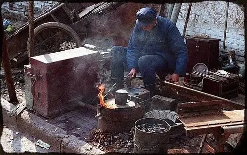 稍微远一点的地方,还能看到铁匠师傅敲敲打打。记得小时候家属院不远的地方,还有个白铁皮铺子,老师傅每天坐在那里剪一剪、敲一敲,比划比划再敲一敲,好像也不着急,就这么敲啊敲的,一个个物件就做好了。