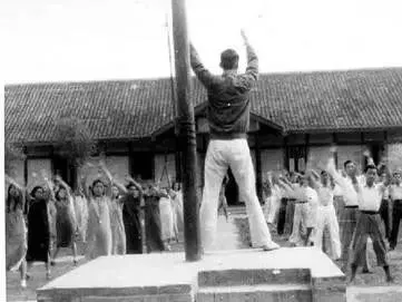 照片里能看到 , 穿着旗袍的女同学们在操场上做操 , 国旗台上站着老师做示范 , 活力满满的~