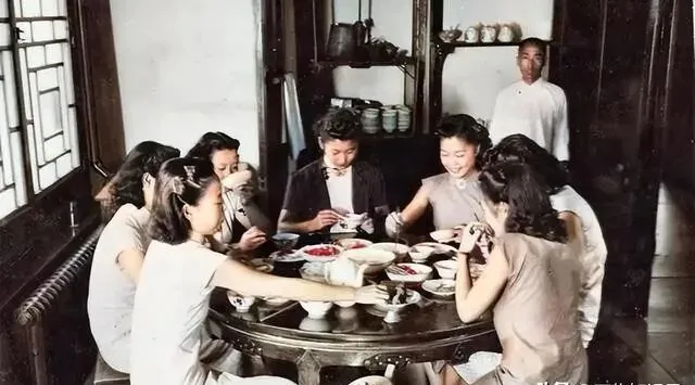 聚餐的时候更讲究 , 浅色旗袍配高跟鞋 , 翘着二郎腿围着圆桌坐 , 桌上菜色丰富得很。