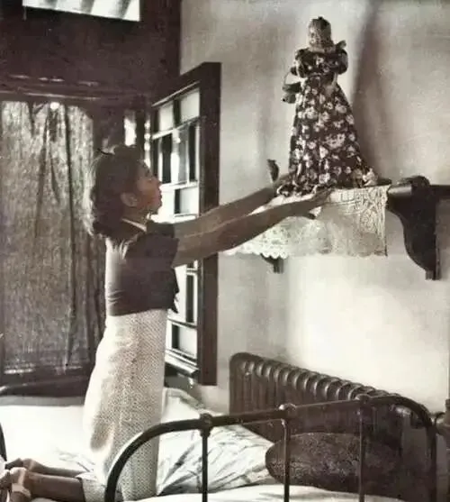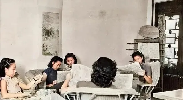照片里一群女子坐在房间里 , 穿着五颜六色的花旗袍 , 卷发贵气十足 , 手里拿着报纸认真看 , 有人还小声讨论着什么。