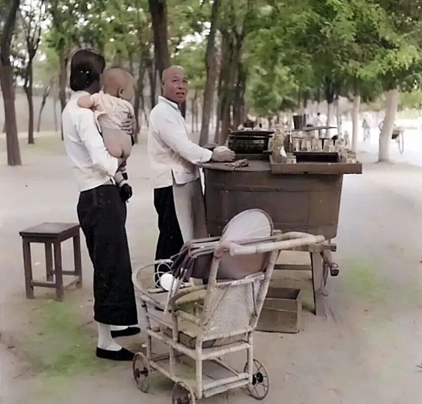 蹲在路边树荫下吃凉糕的人。年轻母亲脚下的高跟凉鞋很时尚