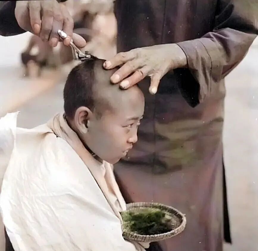 剃头的孩子,需要自己捧着草盘接头发,大概是怕弄脏了地面吧