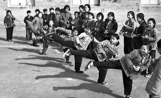 放学铃一响 , 书包往墙角一扔 , 橡皮筋就拉起来了。