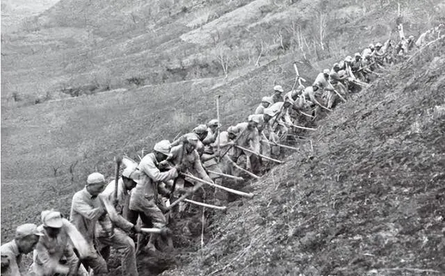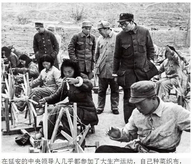 边区军民开始了轰轰烈烈的大生产运动 , 种地、纺线、开荒...