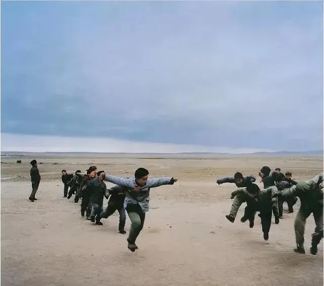 照片里的孩子穿得都差不多 , 蓝的灰的 , 没什么花样。 天倒是蓝得不像话。