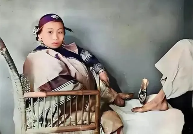 有张照片 , 富家小姐和身后的丫鬟形成鲜明对比。 小姐裹着脚 , 丫鬟是天足。 阶层的区分 , 就写在脚上。