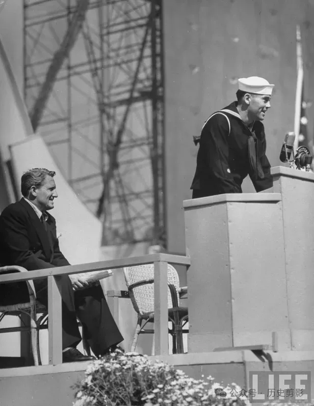洛杉矶市政厅,市长Fletcher Bowron讲话,欢迎宋美龄到访。