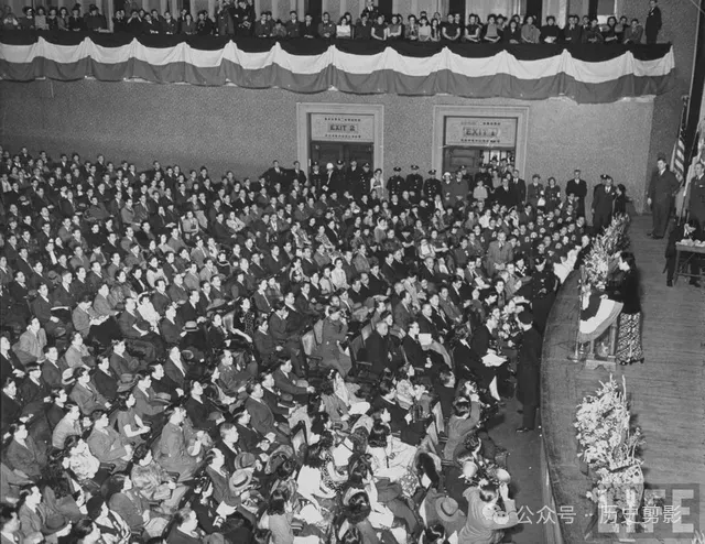 议员和旁听席上皆座无虚席,国会议员们凝神聆听宋美龄演讲,美国国会在礼堂。纽约,美国