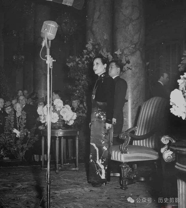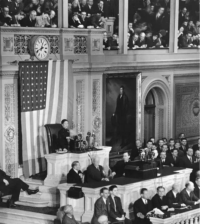 1943年,在中国抗日战争最艰难的时期,宋美龄以中国“第一夫人”的身份访美并在美国国会发表演说,她以流利的英语、感人的语言,向美国国会议员和美国人民介绍了中国人民奋力抗战的艰苦历程。之后,宋美龄又到纽约、波士顿、芝加哥、旧金山、洛杉矶等地演讲募捐,并参加了许多宴会和记者招待会,其足迹几乎遍及美国,引起巨大的轰动效应,宋美龄的美国之行,唤起了美国朝野对中国的同情与更进一步的支持,提升了当时中国的国际地位。