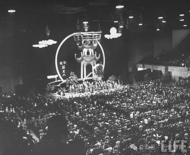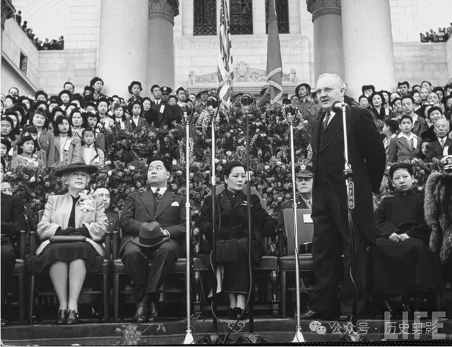 蒋夫人站在舞台上,唐人街招待会