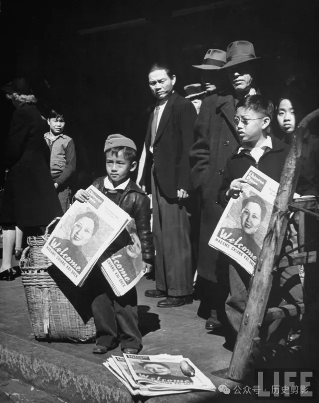 小男孩报童出售欢迎蒋夫人访美的报纸