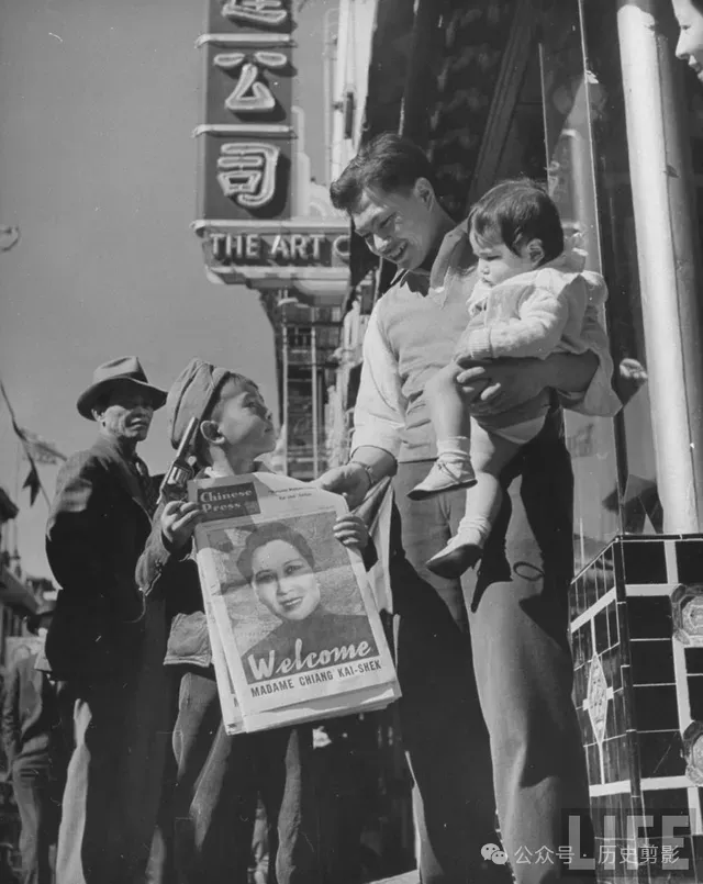 小男孩报童出售欢迎蒋夫人访美的报纸。