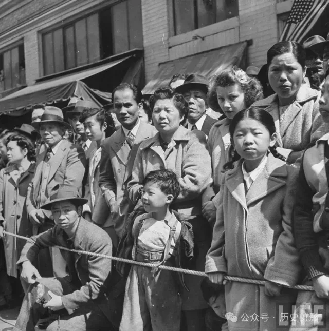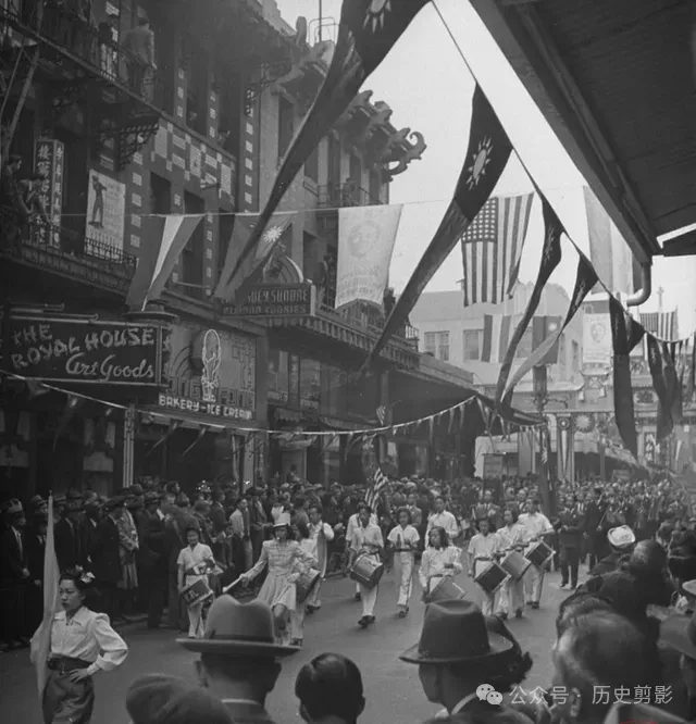 唐人街欢迎蒋夫人访问美国的游行人群。