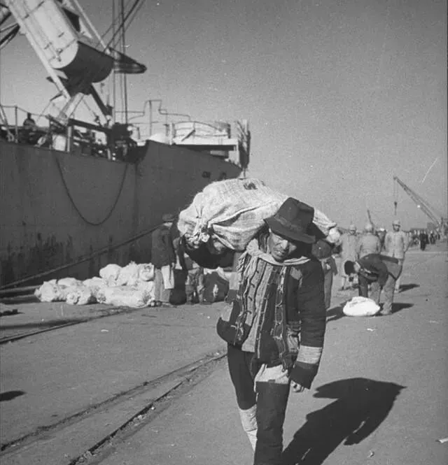 上海码头有个扛货的男人 , 弯着腰 , 货物压在肩上 ,