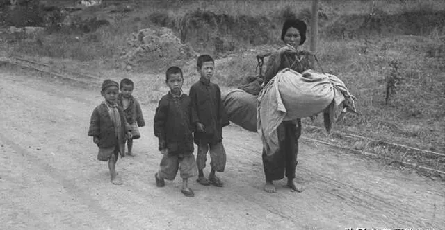 还有个乡村妇女 , 挑着担子 , 带着四个孩子走在马路上 ,