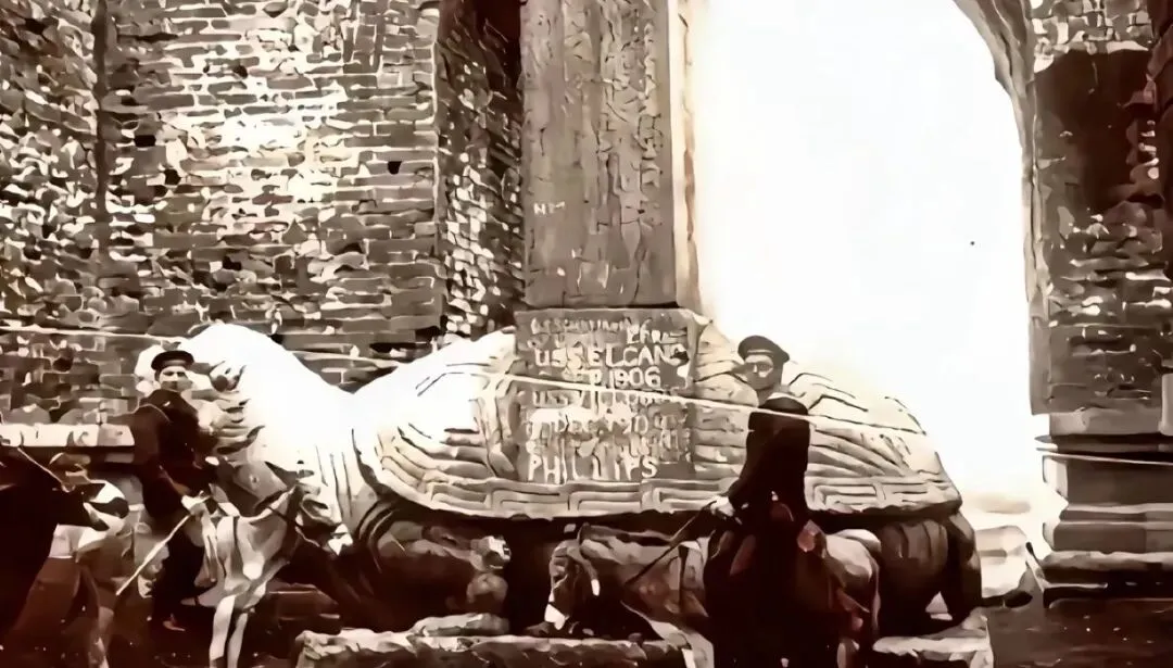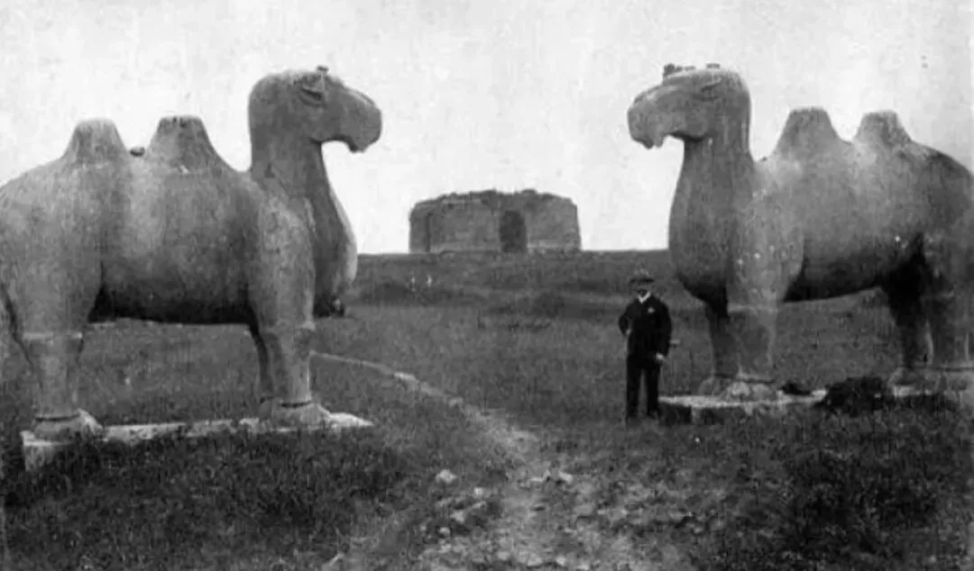 朱元璋陵墓前的石兽照片摄于1900年代,展现了当时文物保护的良好状况。更难得的是,我们还看到了拍摄这些照片的外国摄影师与本地向导的合影,他们骑着驴子在古迹间穿行,记录着这段珍贵的历史瞬间。