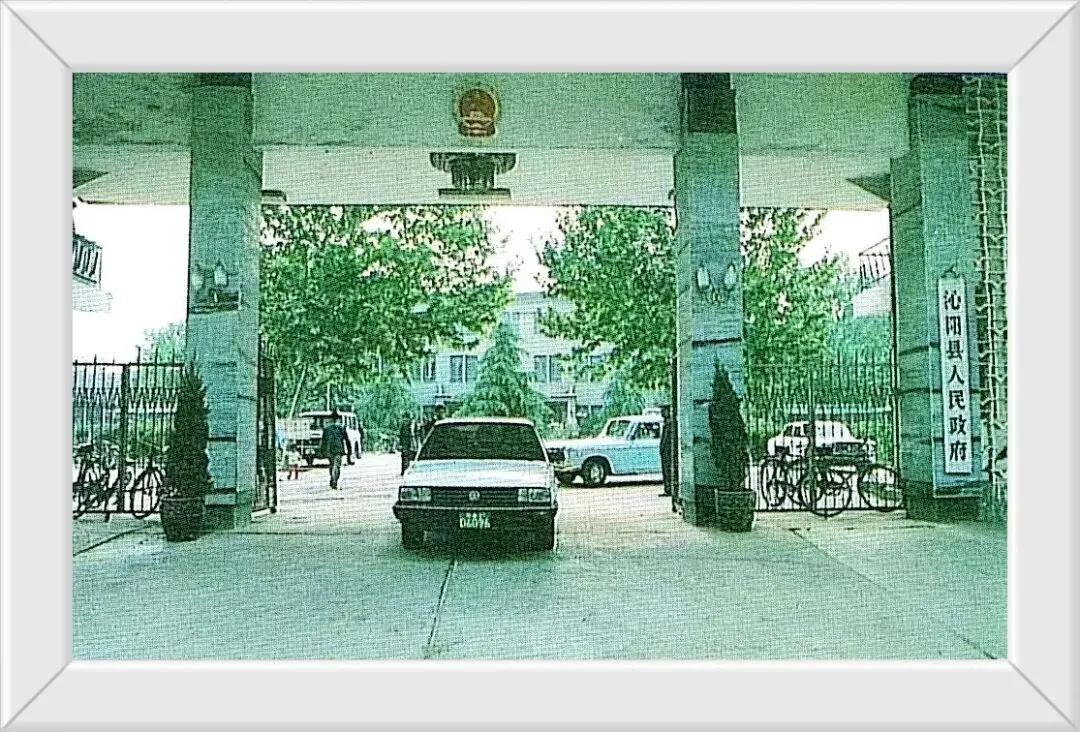汝阳县人民政府。大门内可以看到绿植、办公建筑,门口开出来的桑塔纳轿车在80年代是公务用车,工作人员的代步工具是自行车。
