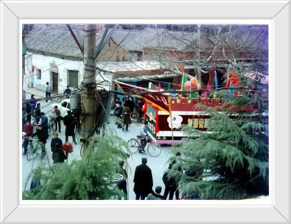 沁阳市春节文艺汇演,这是花车在大街小巷巡游,可以清晰的看到青砖灰瓦的老式民房和临街商铺,乱糟糟的电线杆很抢镜,那时线路还没整,看着比较乱。