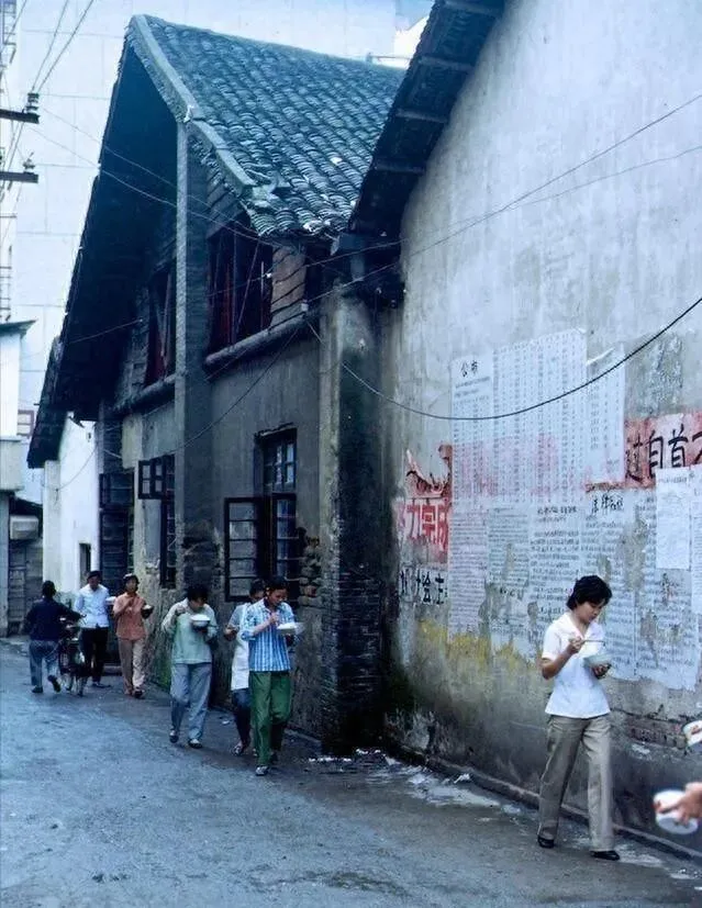 工厂食堂打完饭 , 女工们端着饭盒往宿舍走 , 边走边吃。