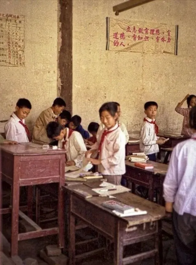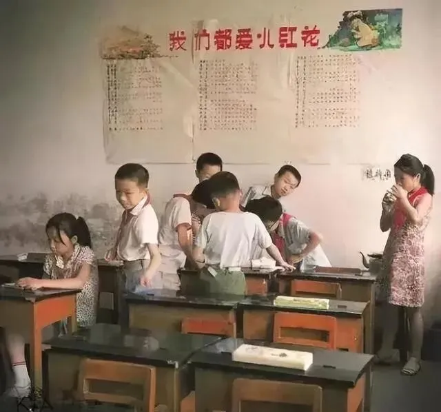 我们那时候的学校 , 土泥巴墙 , 瓦房顶 , 下雨到处漏水。 课桌是长条桌 , 有的还得自己从家里抬去。