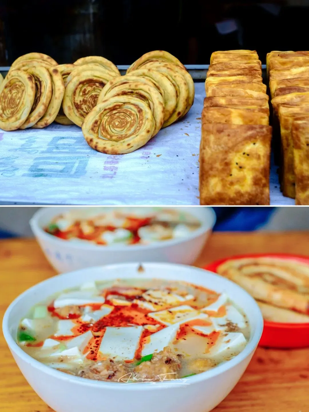 淮南王刘安笃信道教,烧丹炼汞时不慎将卤水点入豆浆之中,阴差阳错而成就了一桩美食。相较于牛肉汤的厚重滋味,豆腐汤清淡却配料丰富,搭配烙馍或油饼,饱腹又添滋味。