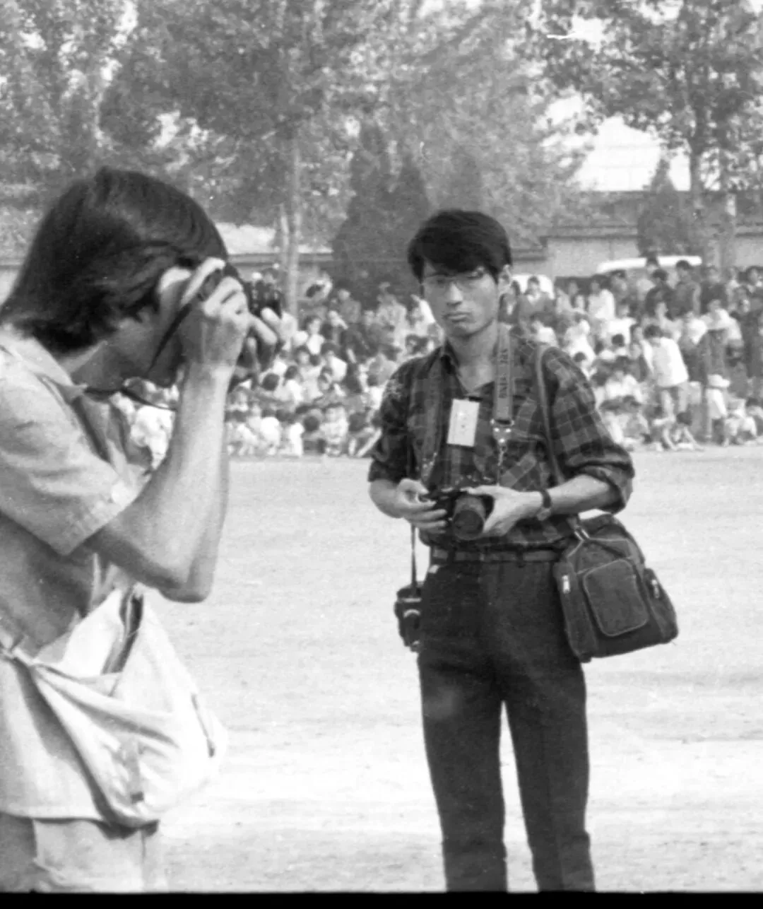 记得那时候,魏先生爱好广泛,尤其是喜欢体育活动。算来总公司篮球赛那年,他应该是55岁吧。喜欢运动就显得年轻,看上去不像年过半百的人,精精神神的。您就看这幅照片上,他那件雪白的衬衫穿得,年轻人都不见得会穿得这样整洁利落,起码我做不到穿着那样讲究。记得那时候魏先生也爱好摄影。喜欢体育,又爱好摄影,那总公司的篮球赛这样重大的体育赛事,他是一定要参与的。他胸前还别着一张“工作人员”证,那证我也有一个。佩戴这个证件,就可以自由出入各个赛场,参加各种活动了,尤其方便拍照片。开幕式上拍照片的人,大家都佩戴着这个证。这证是工作身份,更是工作责任。照片上看,魏老先生白衬衫的外面,是板板正正的中山装。那天有点热,所有的扣子都是解开的。他左肩上挎着一台照相机,相机的外壳皮套还没有打开,背带上用汉语拼音拼写的“摄影”二字,清晰可见,这应该是一个国内生产的、通用的相机背带,倘若是日本品牌的相机,那背带上只能是英文的相机品牌名称,不会是汉语拼音。改革开放之初,很流行汉语拼音,所以,仅从拼音背带上无法确认相机的品牌。魏先生脖子上挎着的,是海鸥4A型照相机,也是国产的经典品牌,这个我看得很清楚。此刻,他正低着头,在摆弄那款崭新的120相机。那相机是我的,是我花75元“巨款”在新区“国营”照相器材商店“捡漏”来的宝贝,我迫不及待地把它带到这样隆重的体育赛事现场,向同行们包括这位前辈“显摆”。照片上,他低头专注摆弄相机的样子很生动,仿佛就在昨天。一晃,三十八年过去了,当年篮球场上的喧嚣早已散去,但胶片所凝固的、他那份热忱、那份专注,那份我们之间跨越年龄的情谊,却愈发清晰。