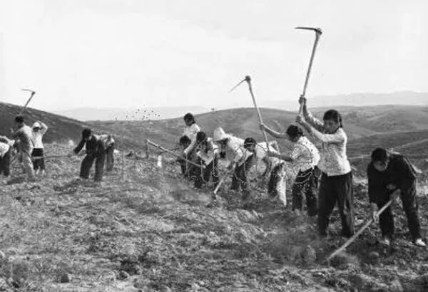 我们村响应号召深翻土地 , 挖一尺五寸深!口号是"深挖一寸 , 增产一倍"。