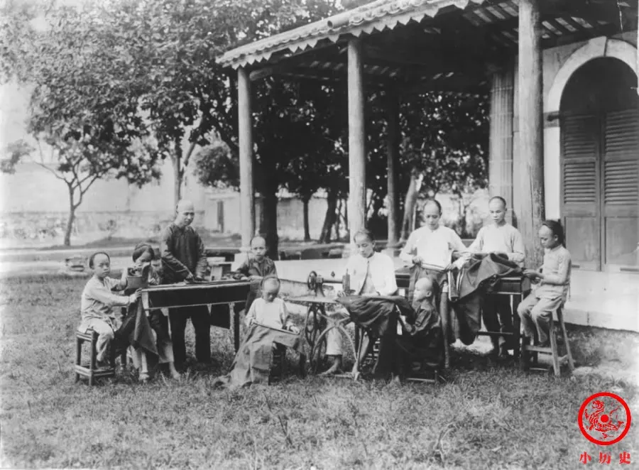 看到这张照片很多人被他们使用的工具吸引,晚清就有缝纫机了吗?是的,早在同治年间,缝纫机就进入了中国市场。1872年12月14日,《申报》发布了一条广告,说:“(晋隆洋行)新到外国缝纫机数辆,每辆洋价50两,欲购请来本行接洽。”当时一台缝纫机价格高达50两银子,简直就是天价,只有富豪之家和专业的裁缝店买得起。